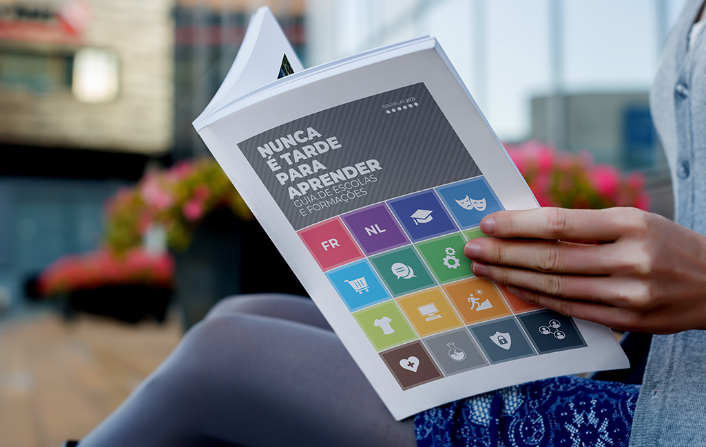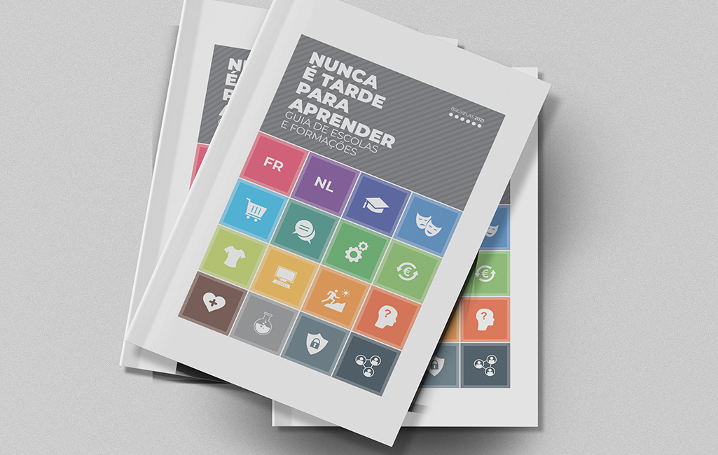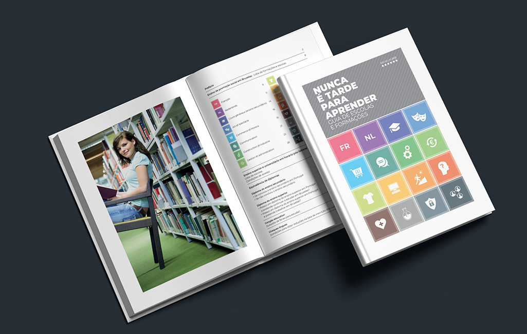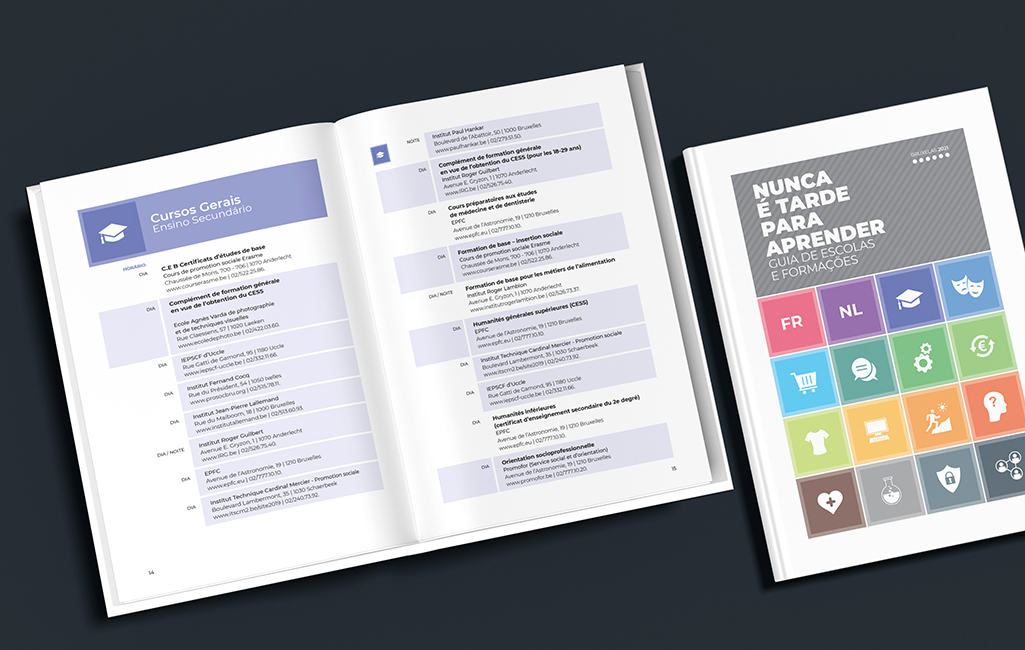 O desafio passava por criar um guia de consulta rápida, de oferta de escolas na Bélgica. Do formato do manual, à otimização do número de páginas, assegurar uma leitura clara e de fácil consulta, foi o que nos propusemos criar. Para isso foram desenvolvidos ícones para cada temática e cada um com a sua cor cromática identificativa. Foi feita uma separação de cada instituição de ensino com fundos de cor e feita uma seleção de fontes e tamanhos que ajudassem na consulta do guia.